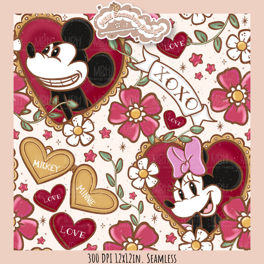 Tattoo FloralMouse Hearts Seamless Pattern // PNG //Multiple Colorways