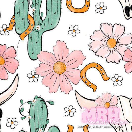 Boho Cactus Floral Cow Skull Seamless Pattern