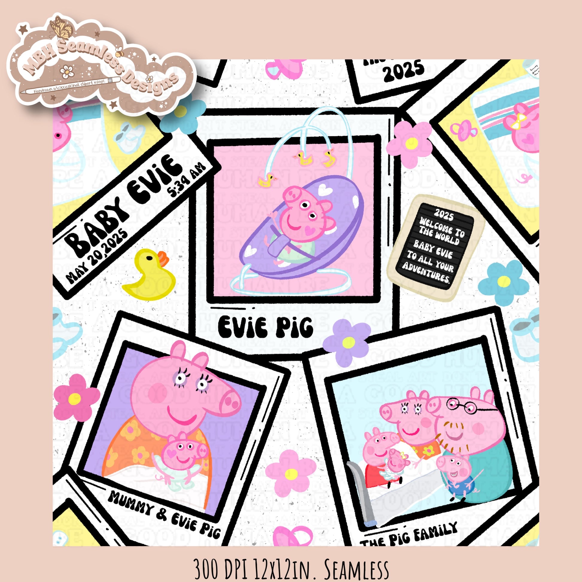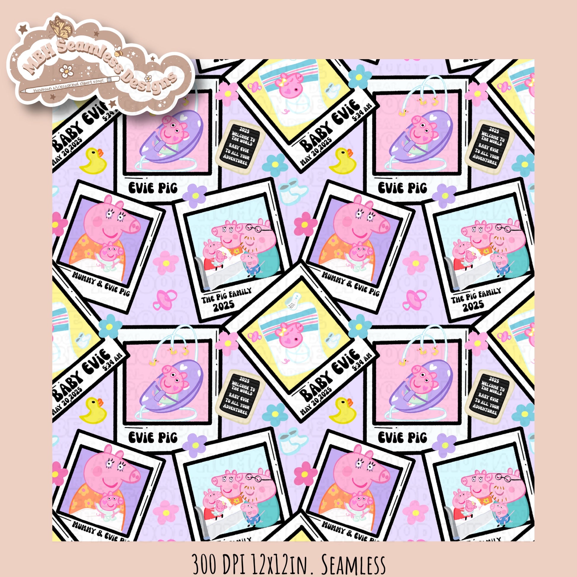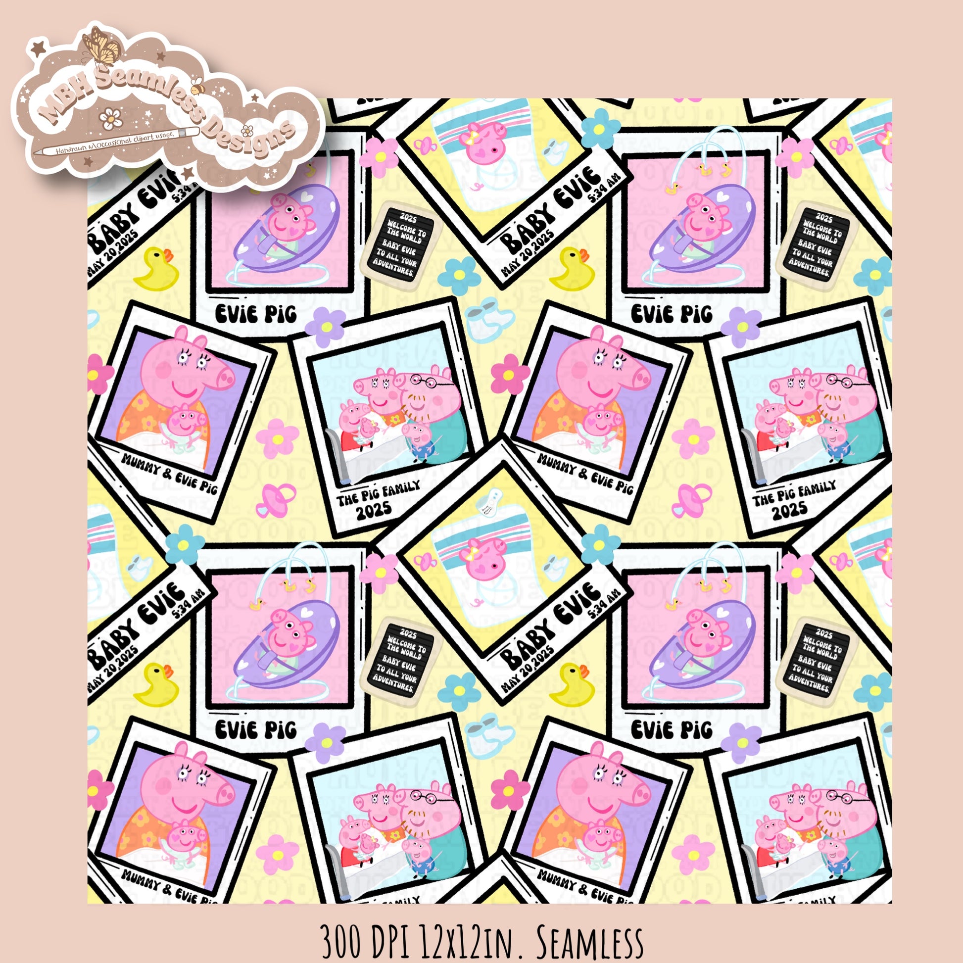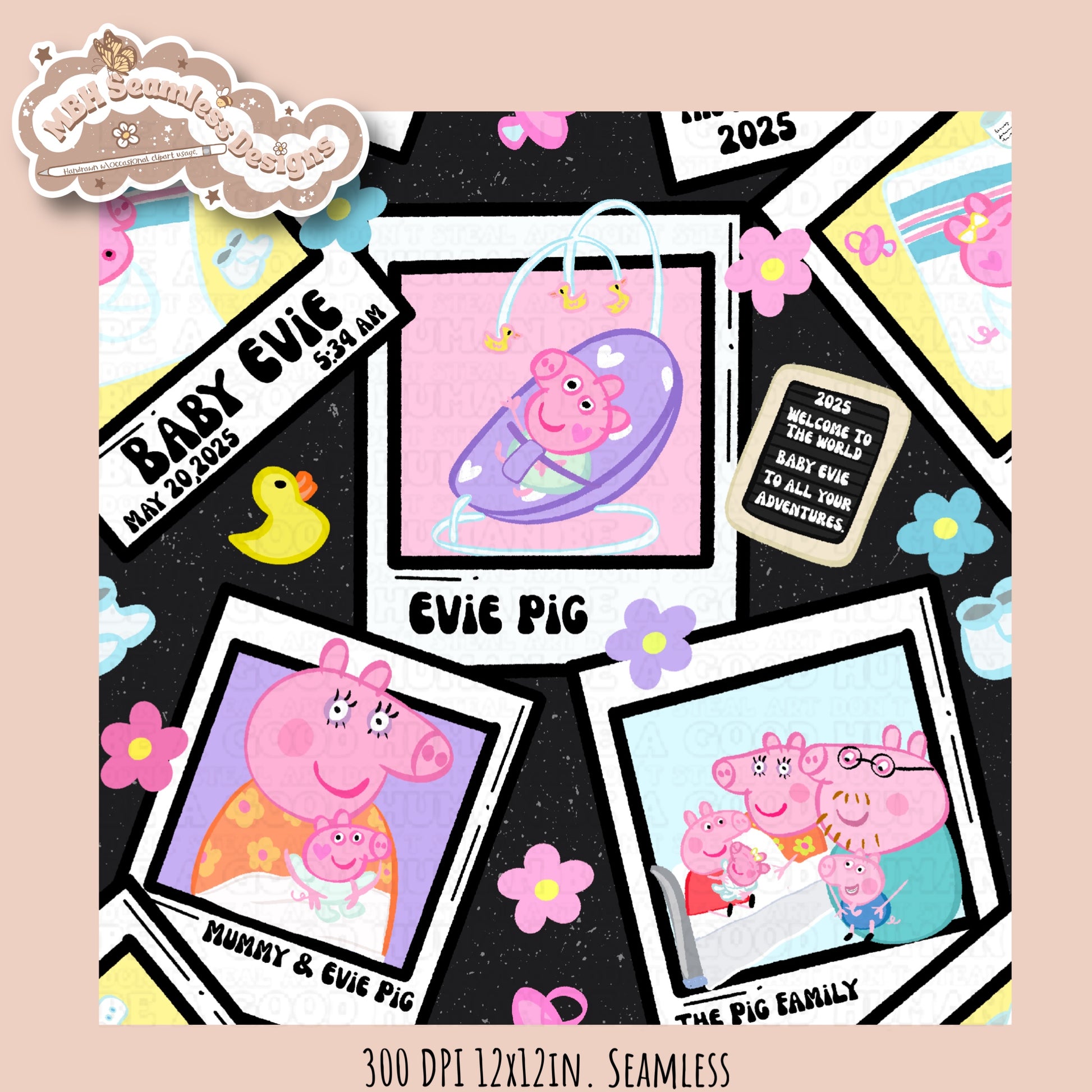 Black Outline Evie Pig Polaroids Seamless Pattern • Multiple Colorway Options
