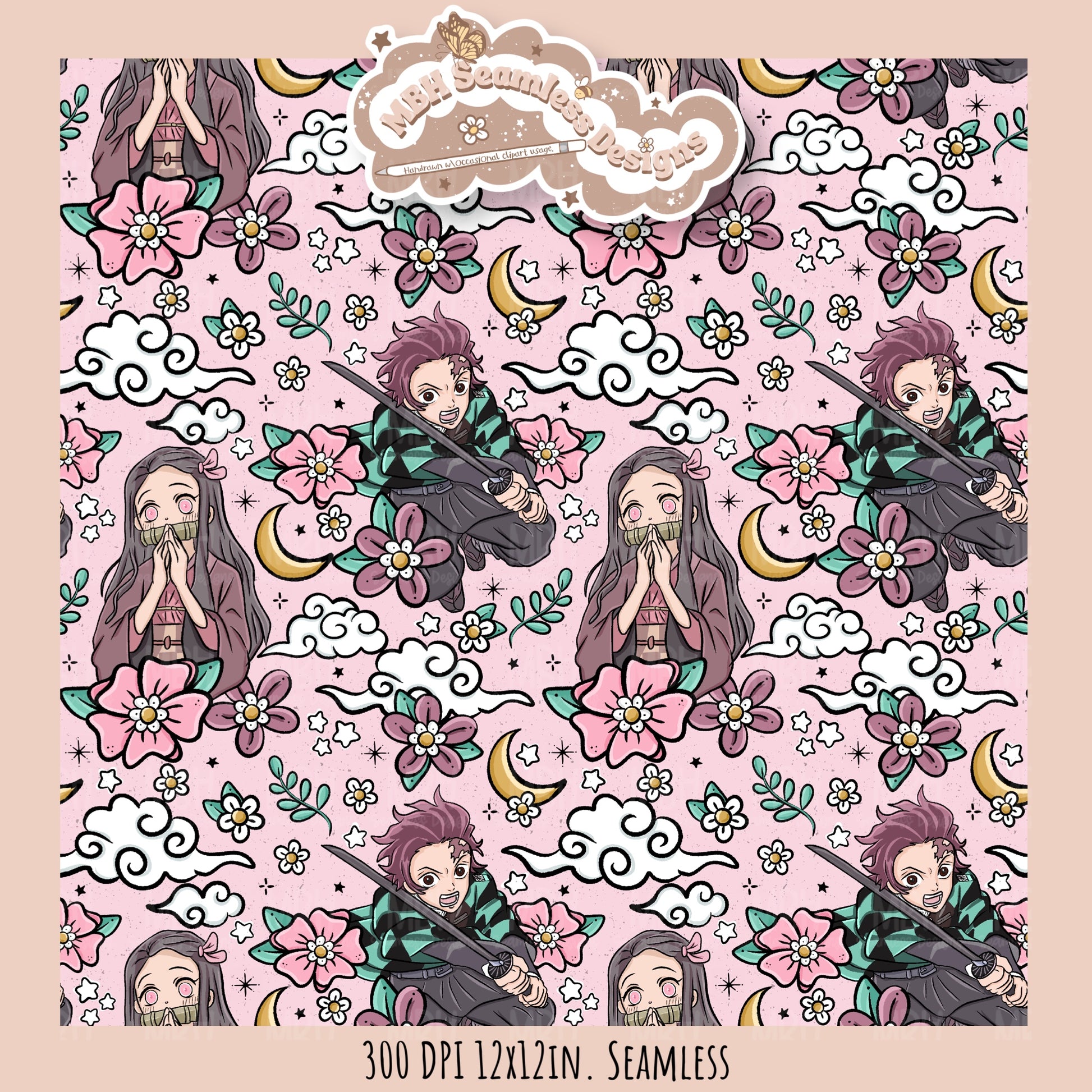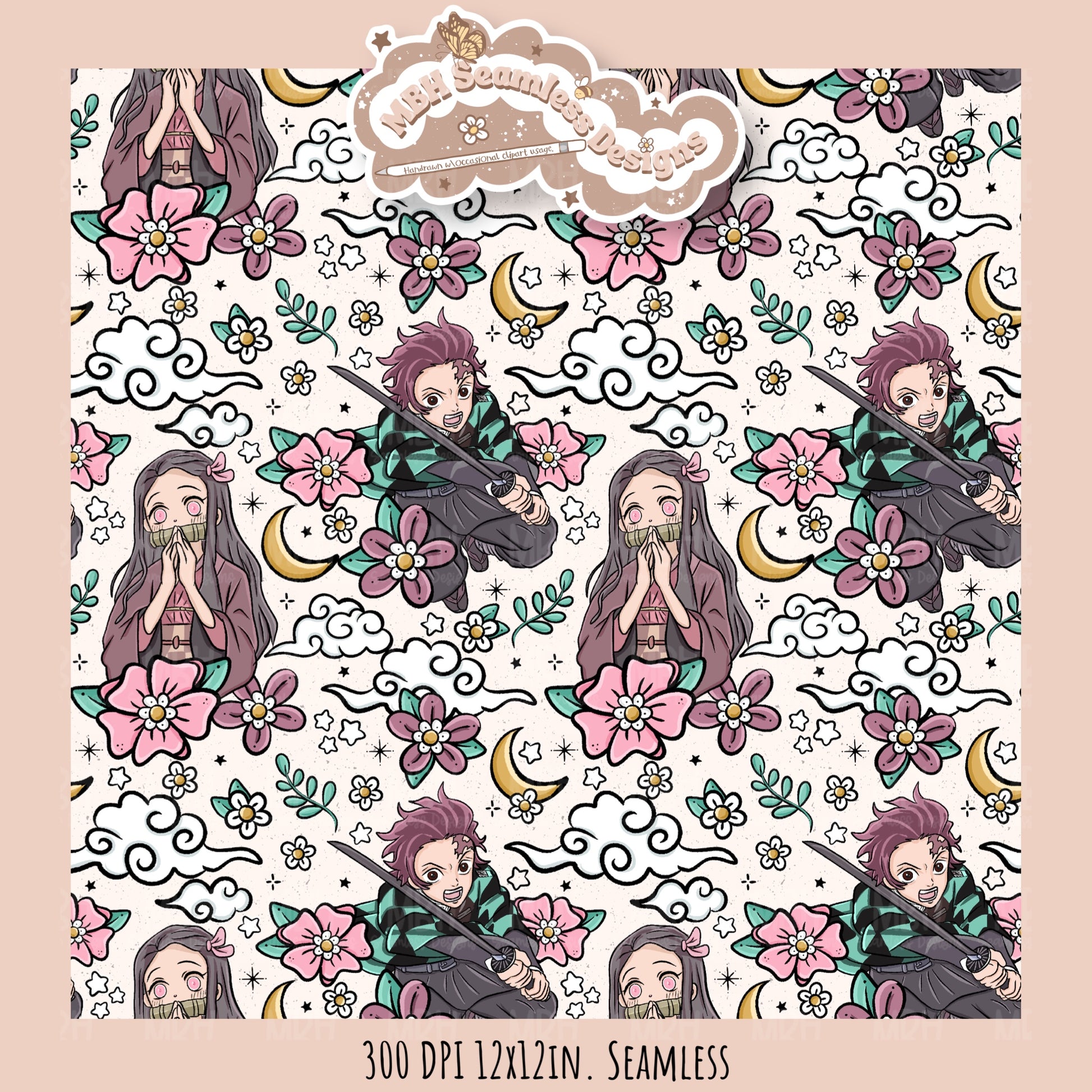 Tanjiro Nezuko Floral Seamless Pattern // MULTIPLE COLORWAY OPTIONS